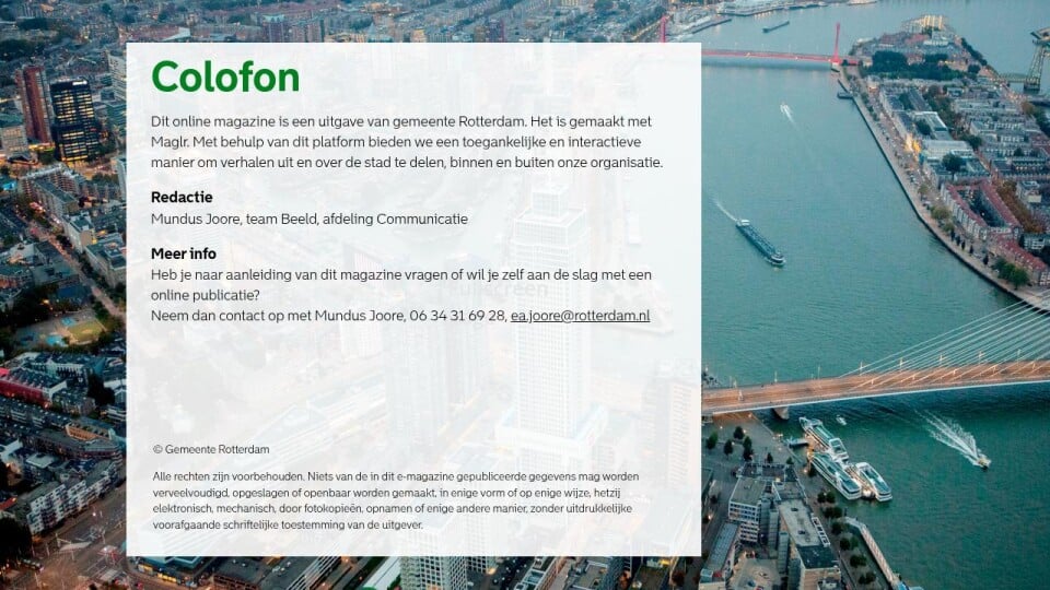 Dit online magazine is een uitgave van gemeente Rotterdam. Het is gemaakt met Maglr. Met behulp van dit platform bieden we een toegankelijke en interactieve manier om verhalen uit en over de stad te delen, binnen en buiten onze organisatie.