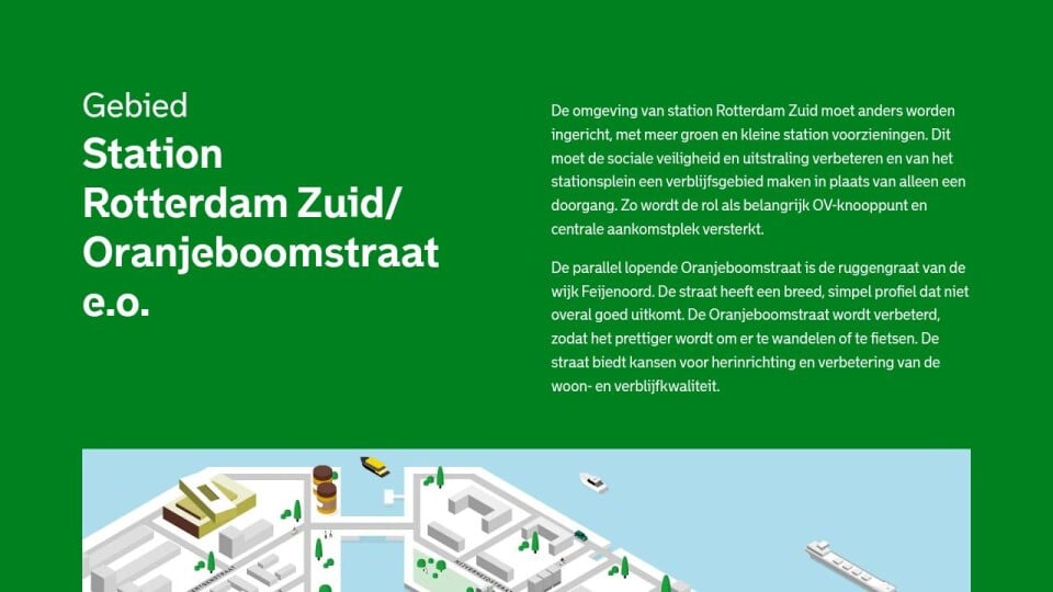 De omgeving van station Rotterdam Zuid moet anders worden ingericht, met meer groen en kleine station voorzieningen. Dit moet de sociale veiligheid en uitstraling verbeteren en van het stationsplein een verblijfsgebied maken in plaats van alleen een doorgang. Zo wordt de rol als belangrijk OV-knooppunt en centrale aankomstplek versterkt.